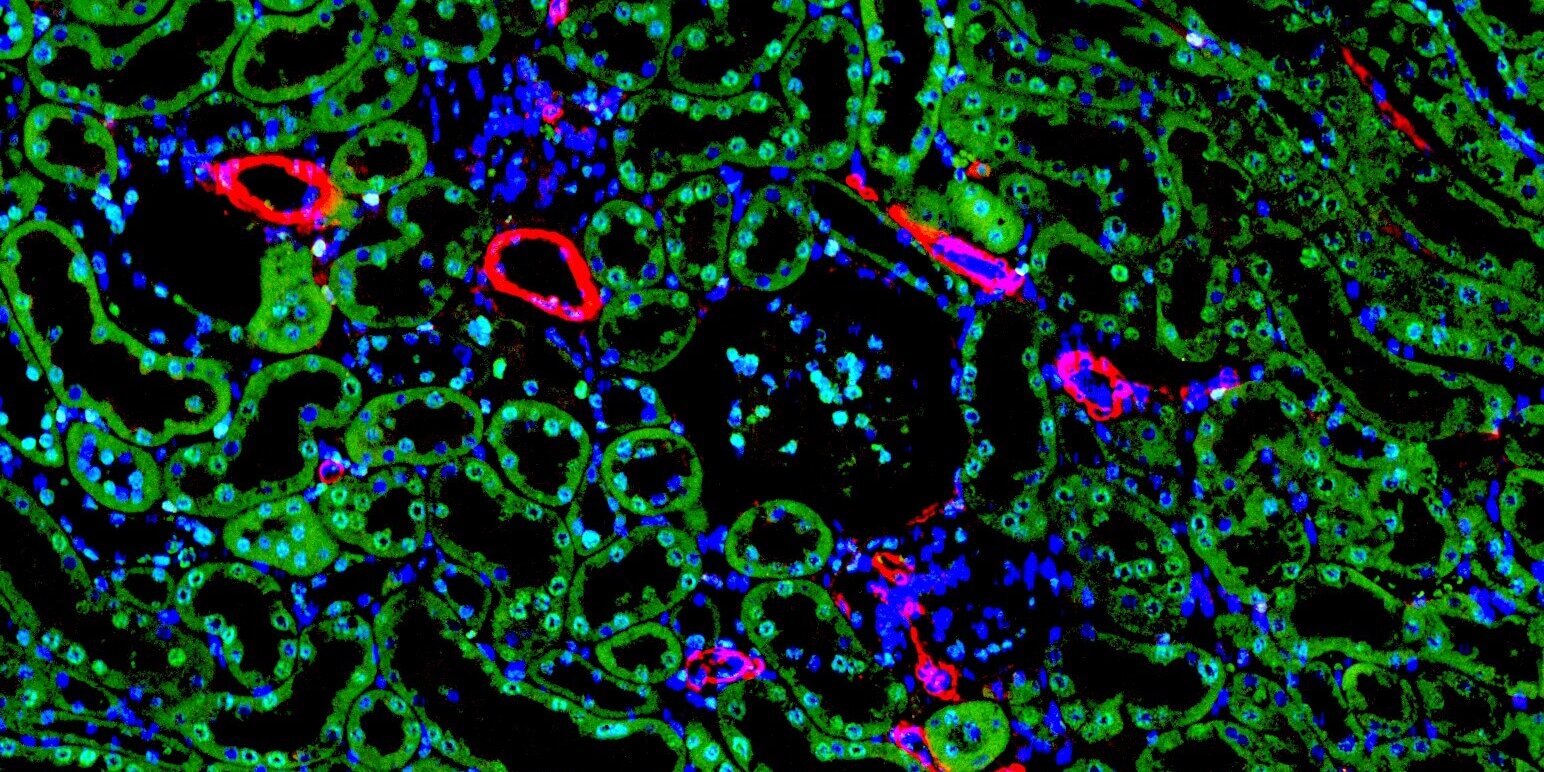 11 月22021最新消息立眾病理 腎臟組織切片- 免疫螢光染色 (immunofluorescence, IF) 小鼠腎臟組織,使用2個不同的免疫標記(marker)及DAPI,以立众實驗室 獨家代理的BioTnA – Tools of molecular pathology TATS01 免疫螢光(IF)染色套組進行染色,並使用螢光數位掃描取得完整腎臟的螢光組織圖,果然在優秀的技術、穩定的染色試劑及先進儀器的搭配下,就能有漂亮的染色成果! Post navigationPreviousPrevious post:動物外科病理-腫瘤淋巴結轉移NextNext post:恭喜立众病理實驗室客戶的研究再一次登上頂尖國際期刊 !!Related Posts犬口腔T細胞淋巴瘤 (T cell lymphoma)2022-07-22Picro-Sirius red 天狼星紅染色2022-07-22皮膚專科的病理診斷服務來囉!2022-07-22Modified Movat’s Pentachrome 染色法2022-07-22植物也能做組織切片!!?2022-03-23脛骨平台切片&生長板2022-03-23